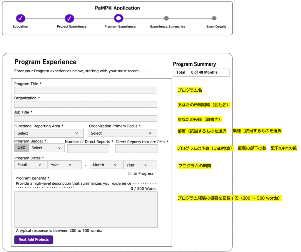 大卒の場合は48ヶ月以上のプログラムマネジメント経験を記載するが、48ヶ月に満たない場合は48ヶ月以上になるように複数のプログラム経験を記載。(大学院卒の場合は36ヶ月以上。高校卒の場合は84ヶ月以上。)