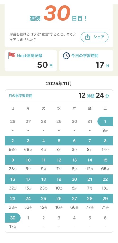 30日間で、合計12時間24分という状況より、平均すると1日約25分です。決して多い取り組み時間とは言えませんが、取り組み自体は決して苦にはならず、むしろ楽しく感じているので、今後も継続していけると思っております。