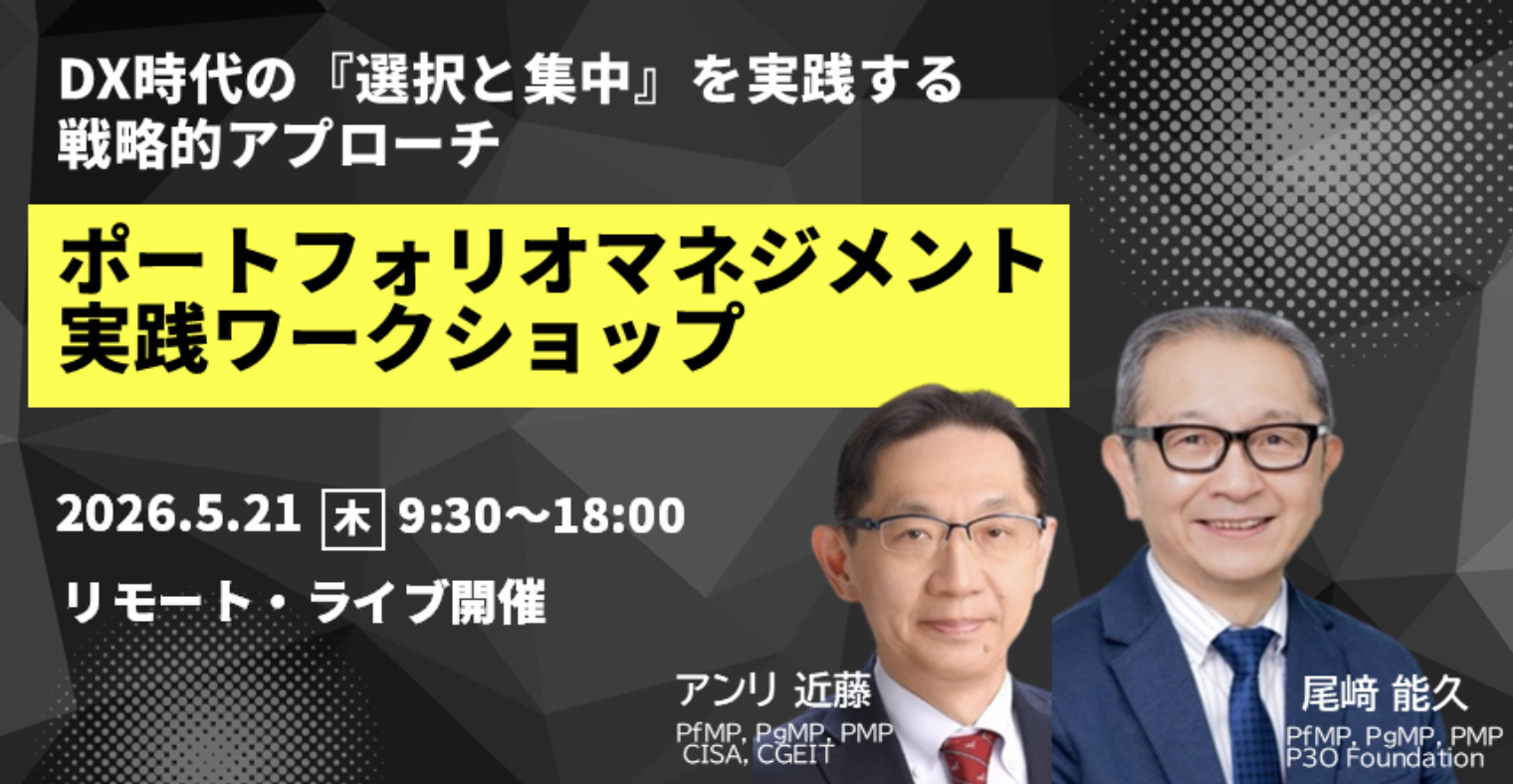 DX時代の『選択と集中』を実践する戦略的アプローチ「ポートフォリオマネジメント実践ワークショップ」を開催いたします(2026年5月21日)。このワークショップは、PMI日本支部のスキルアップ研修(PMI 7PDU)として、リモート・オンラインで開催される一日コースとなっております。